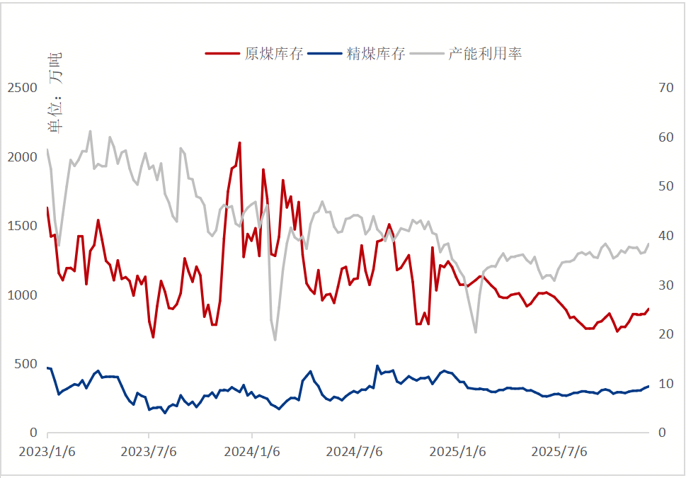 從上游端庫存的角度看,2025年煤礦端開工率保持平穩(wěn)波動,除一月份農(nóng)歷春節(jié)假期外整體開工率在80%區(qū)間內(nèi)窄幅震蕩波動運(yùn)行。2025年均值為84.28%略低于2024年的86.15%,據(jù)Mysteel調(diào)研數(shù)據(jù)顯示,全國314家洗煤廠樣本全年平均開工率為34.48%,同比減少6.02%。而庫存方面也能看到較去年小幅減少,全年平均水平相較2024年低10萬噸左右。截至2025年12月中旬,據(jù)Mystee調(diào)研數(shù)據(jù)顯示,全國314家洗煤廠樣本原煤庫存893.92萬噸,同比減少303.78萬噸,降幅25.36%;精煤庫存332.37萬噸,同比減少113.01萬噸,降幅25.37%。2025年,旺季不旺,淡季不淡的特征導(dǎo)致洗煤廠庫存整體高位逐漸回落,精煤維持安全庫存區(qū)間。