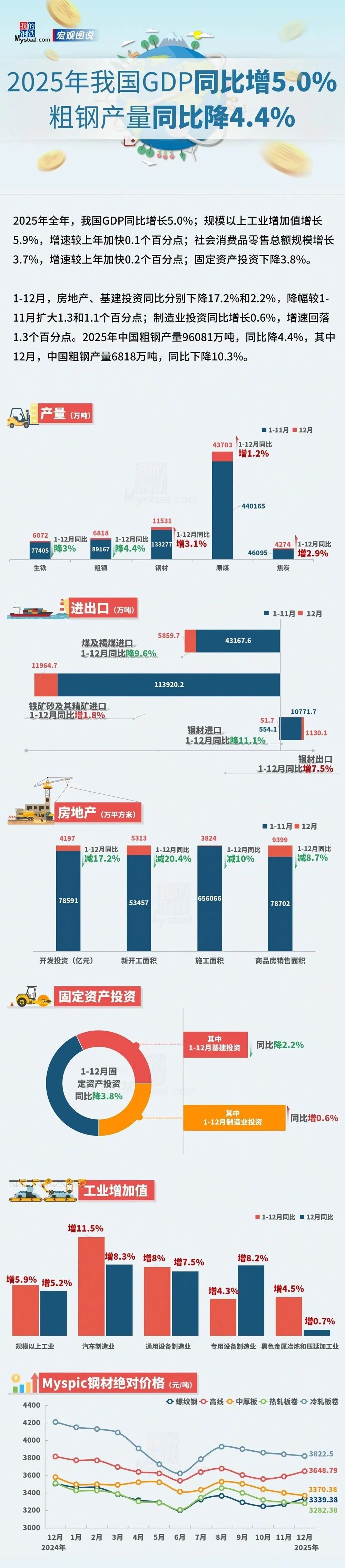 圖說(shuō):2025年我國(guó)GDP增長(zhǎng)5.0%,粗鋼產(chǎn)量下降4.4%